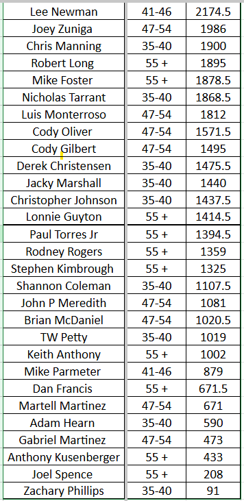 | Frank Hobdy | 55+ | 59 | Cotton Mouth | Dodson |