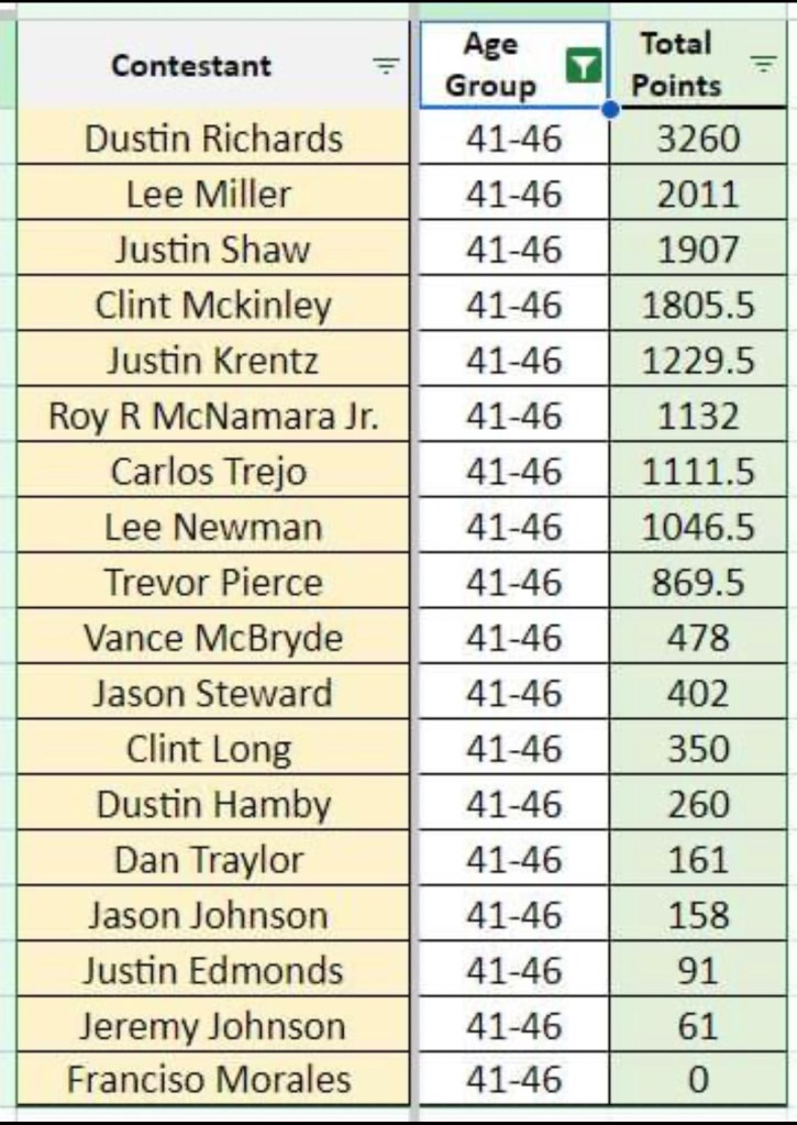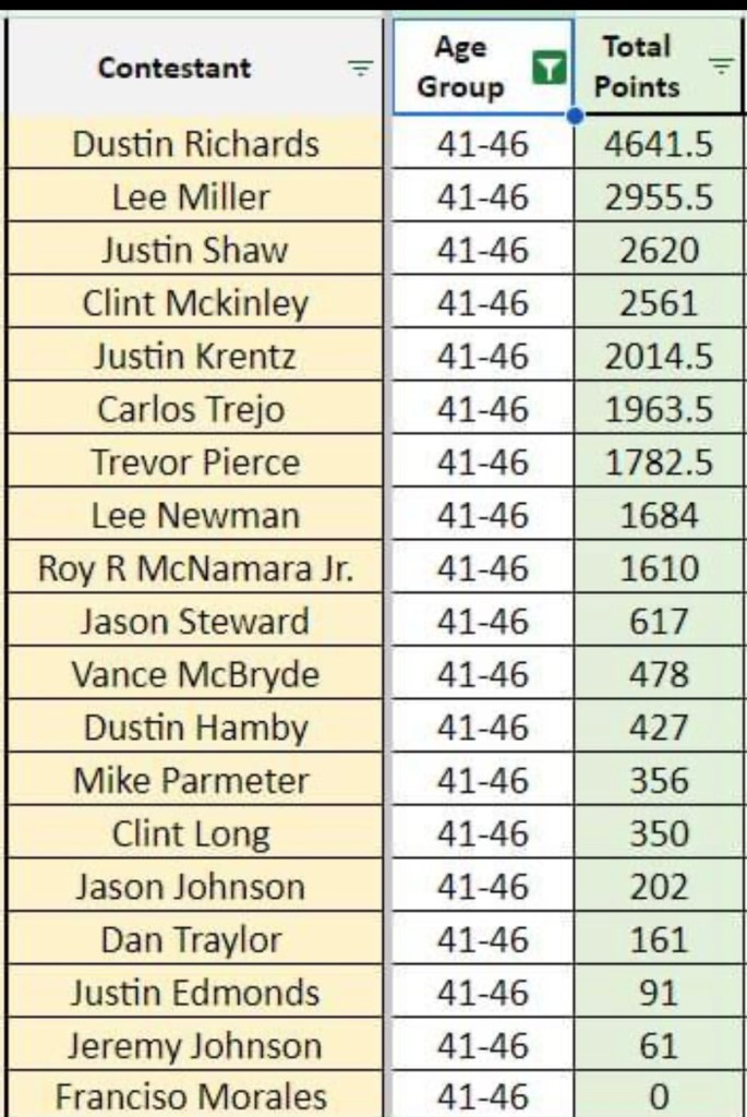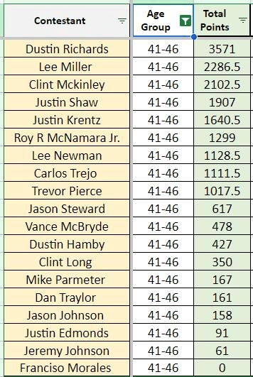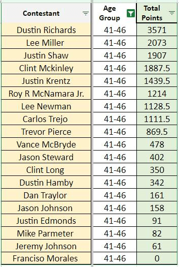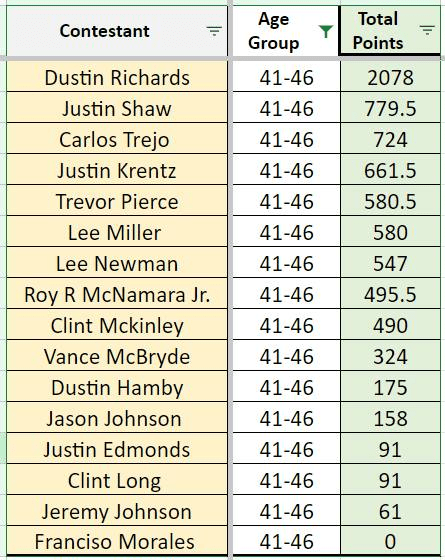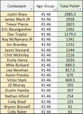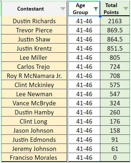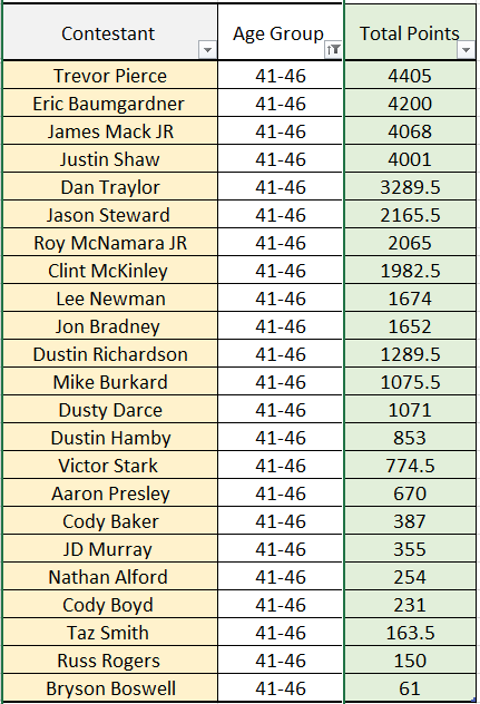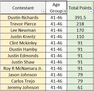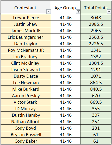 | Contestant | Age Group | Event #1 WW | Event #2 Laredo | Event #3 Laredo | Event #4 Wright City | Total Points |