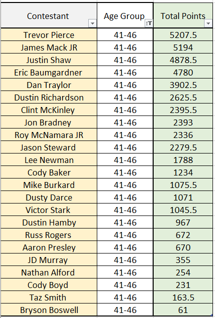 Finals 2023 Trevor Pierce41-466295.5James Mack JR41-466178Justin Shaw41-465938.5Eric Baumgardner 41-465261Dan Traylor41-464485.5Dustin Richardson41-463476.5Jon Bradney 41-462944Clint McKinley 41-462889Roy McNamara JR41-462804Jason Steward 41-462471.5Lee Newman41-462012Cody Baker41-461707.5Dustin Hamby41-461159Victor Stark 41-461109.5Russ Rogers 41-461101.5Mike Burkard41-461075.5Dusty Darce41-461071Aaron Presley41-46670JD Murray 41-46355Nathan Alford 41-46254Cody Boyd 41-46231Taz Smith 41-46163.5Bryson Boswell41-4661