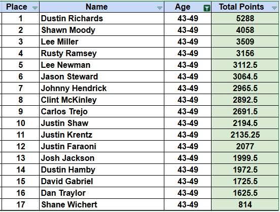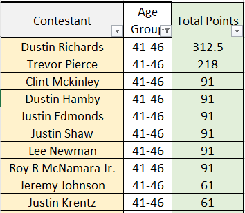 | Dustin Richards | 41-46 | 312.5 | 79 | 79 | 286.5 | 757 |