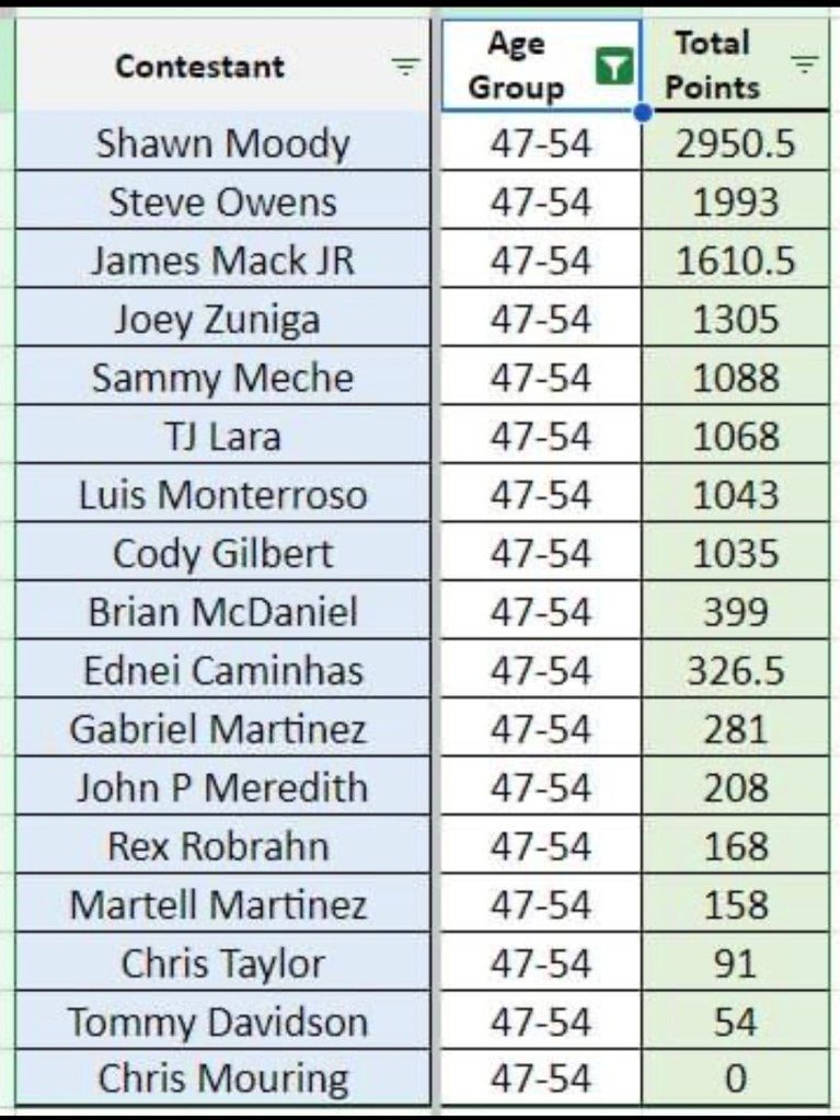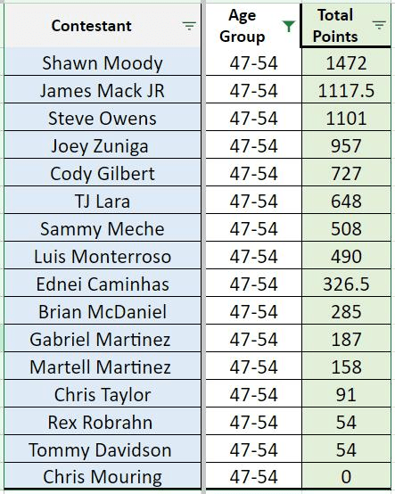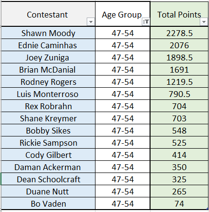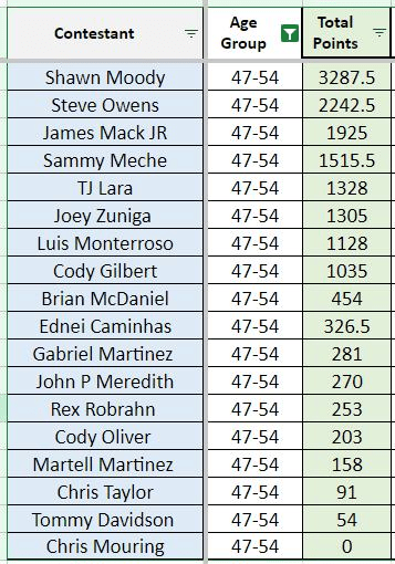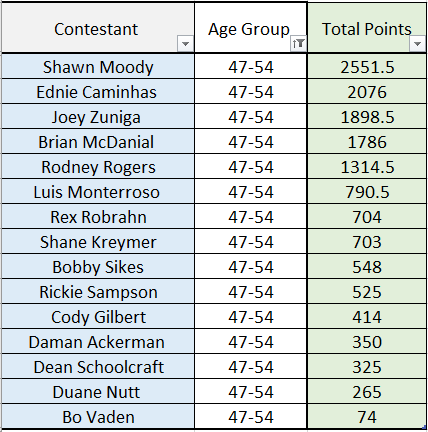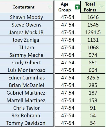 Finals 2023 Shawn Moody47-545500.5Rodney Rogers47-544356.5Brian McDaniel 47-543532Joey Zuniga 47-543234.5Luis Monterroso 47-542891.5Ednie Caminhas 47-542076Sammy Meche 47-541334Rex Robrahn47-541305Cody Gilbert47-54839.5Shane Kreymer47-54703Bobby Sikes47-54548Rickie Sampson47-54525Daman Ackerman 47-54350Dean Schoolcraft47-54325Duane Nutt 47-54265Bo Vaden47-54186